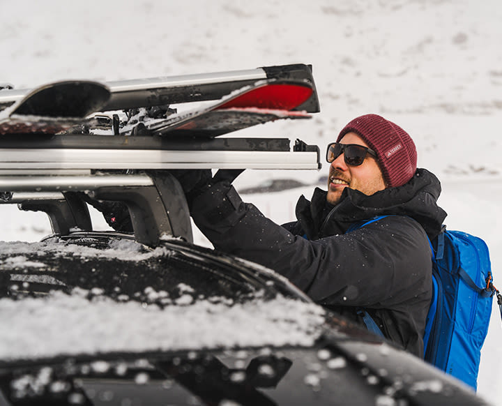 Before you hit the piste, hit the roof. The lockable Ski and Snowboard Holder can be pulled out at the side and fits all MINI roof rack systems. It can carry up to five pairs of skis or four snowboards safely to the slope and back. It can also hold ski poles and fulfils the highest quality and safety standards.